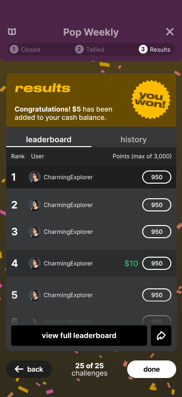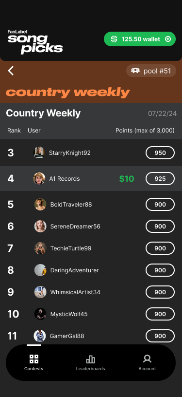 Join contests with entry fees as low as $1 and compete for cash prizes based entirely on your music insights.
